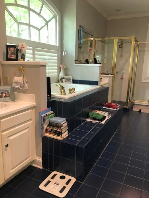 As you can see, we had plenty of square footage to work with in this bathroom, but the navy tile was feeling tired and the steps up to the raised tub felt outdated and awkward.