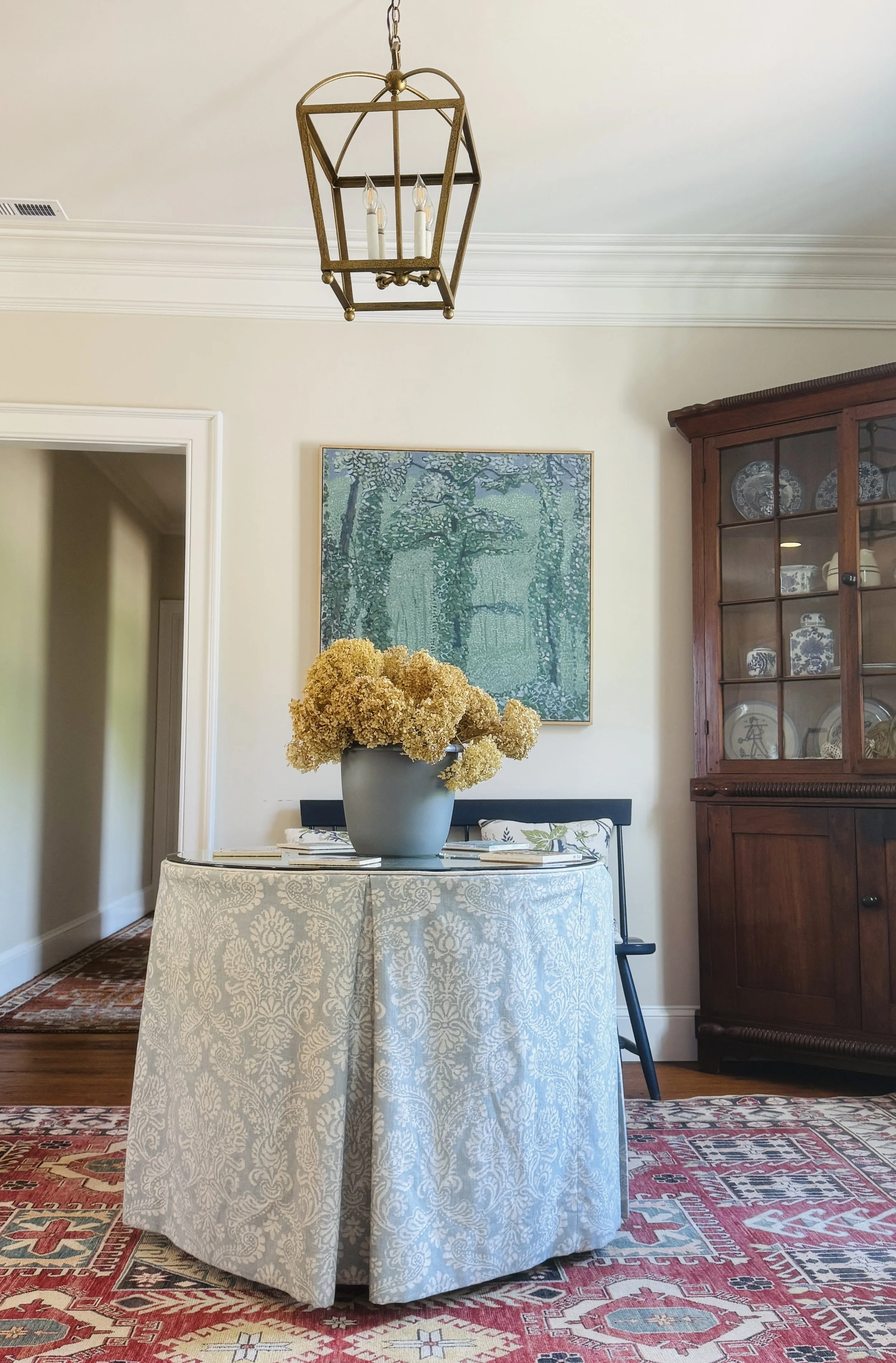 Most recently we incorporated a skirted table in the center of a turreted sunroom on Elder Mountain. It displays the homeowners personal artifacts in such a stylish way. Gardening books, photos, candlesticks and the horse sculpture were all sourced from within their home. This project was a portion of a kitchen and sunroom renovation that included the creation of a mud room. More photos to come soon!