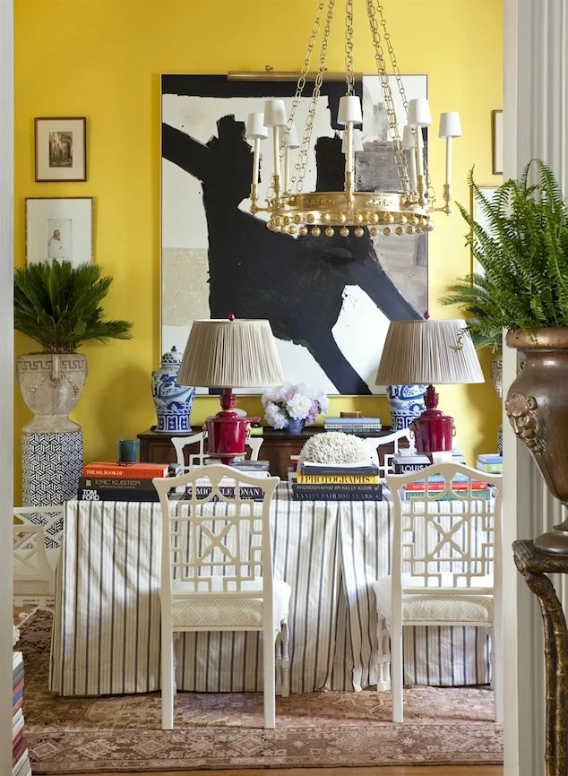 In the dining room above by William McClure, a casual skirted table works as a library table to get maximum functionality from a single room. The stripes feel effortless and tone down the formality of the space. Gorgeous room all around, and one to file away for future reference.