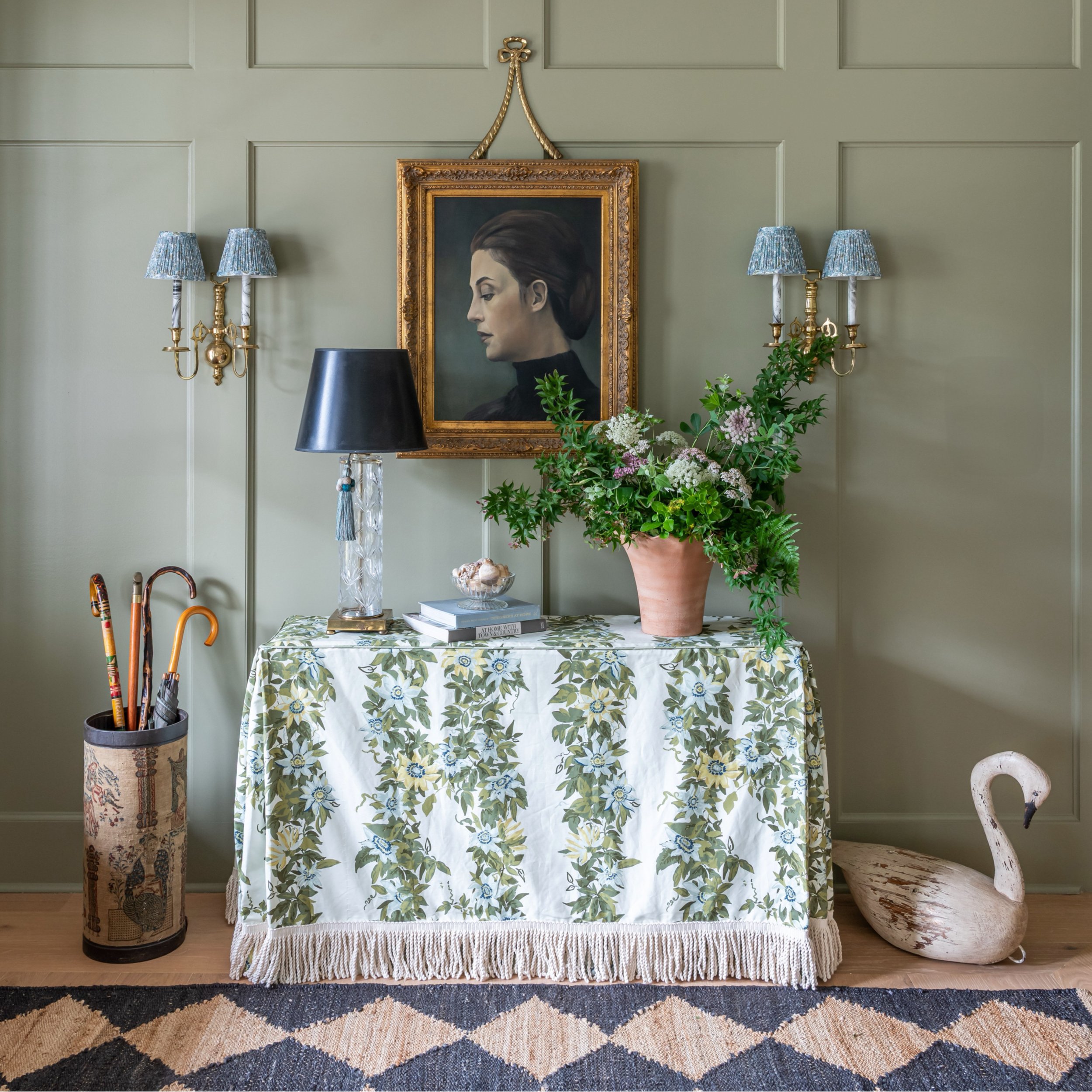 Think on this. Most entryways are little more than flooring, walls, a door and a light fixture. This is where a beautiful fabric accented with trim can do the heavy lifting to make a great first impression! The right fabric selection can introduce your home’s color palette and add softness and personality from the moment you enter your home. 10/10 recommend.