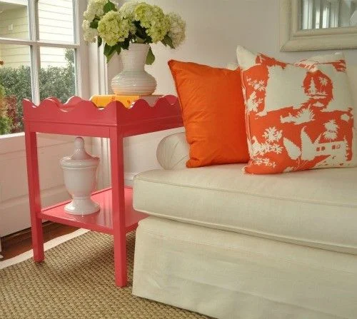 The pink and orange color palette seen above is so crisp against the white walls and white upholstery, and the scalloped edge along the top of the side table adds movement and charm to an otherwise boxy design.